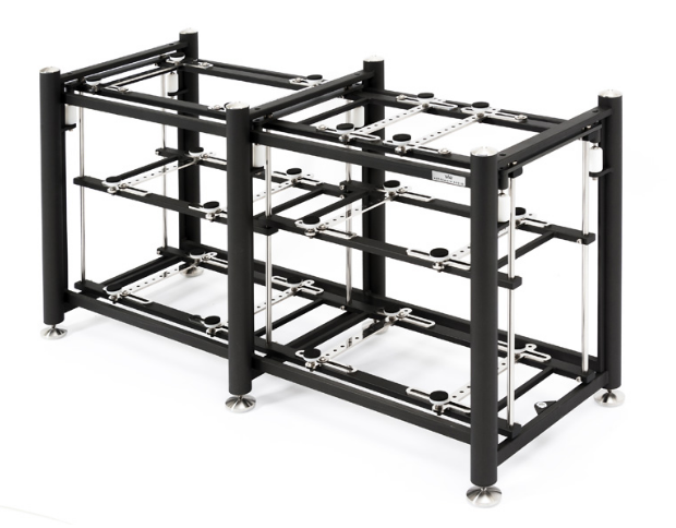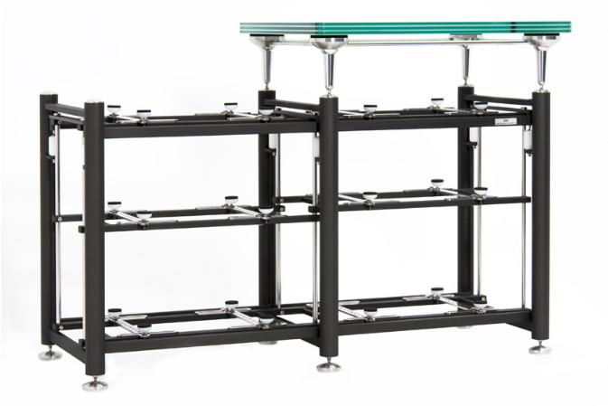 Конструкция из нержавеющей стали с антимагнитными свойствами. Вертикальные опоры диаметром 45 мм со стальным навершием с выемками конической формы устанавливаются на диски из нержавеющей стали Prestige base. Внутренняя подвесная конструкция. Тефлоновые цилиндры поддерживают внутренний каркас и изолируют его от внешнего (диаметр – 38 мм). Заземляющий зажим. Стальная перемычка придает дополнительную прочность внешнему каркасу. Горизонтальные перекладины изготовлены из противомагнитной нержавеющей стали. На них установлены шипы, расположение которых можно менять, а также изоляционные диски и демпфирующие прокладки. Размещенные во внутреннем каркасе стабилизаторы предотвращают ее мельчайшие маятниковые колебания. 2 вертикальных и 2 горизонтальных уровня.
